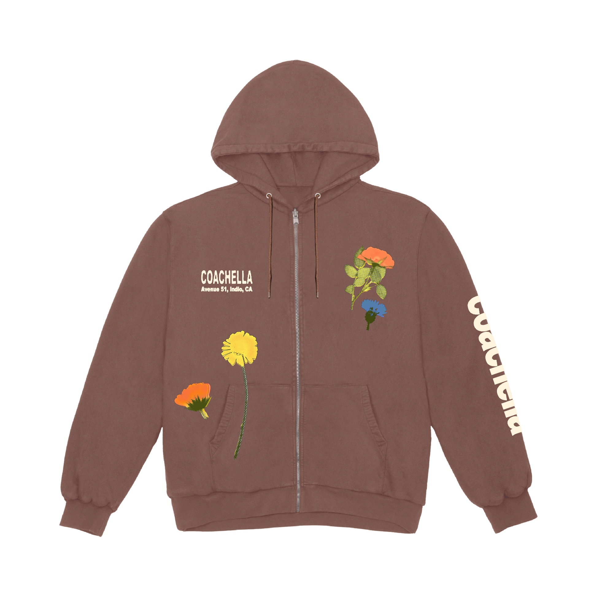 Heavyweight zip-up hoodie in brown, featuring Pressed Flowers logo art printed on the front and the 2026 Coachella lineup printed on the back. 60/40 cotton/polyester blend. Unisex, relaxed fit.