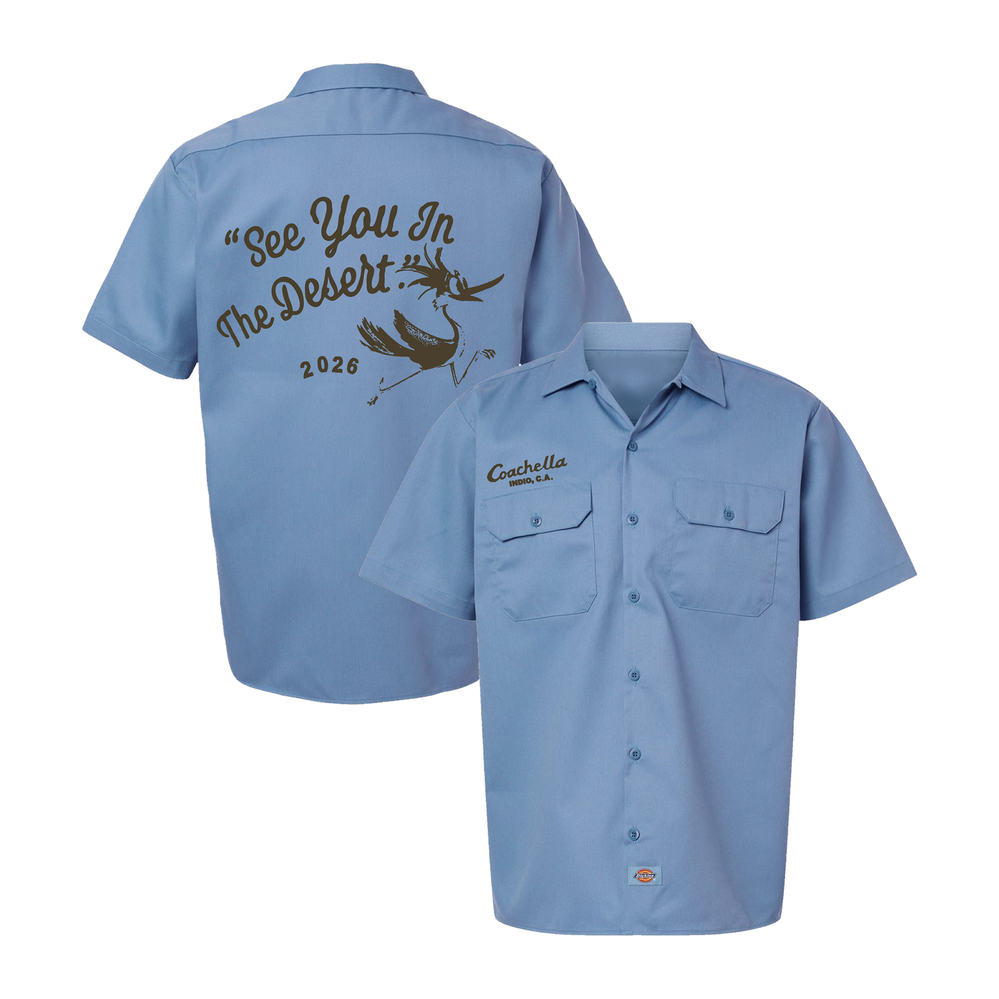 Button-up Dickies work shirt in light blue, featuring Zippy's Garage logo art printed on the front and back. 65/35 polyester/cotton twill. Unisex, relaxed fit.